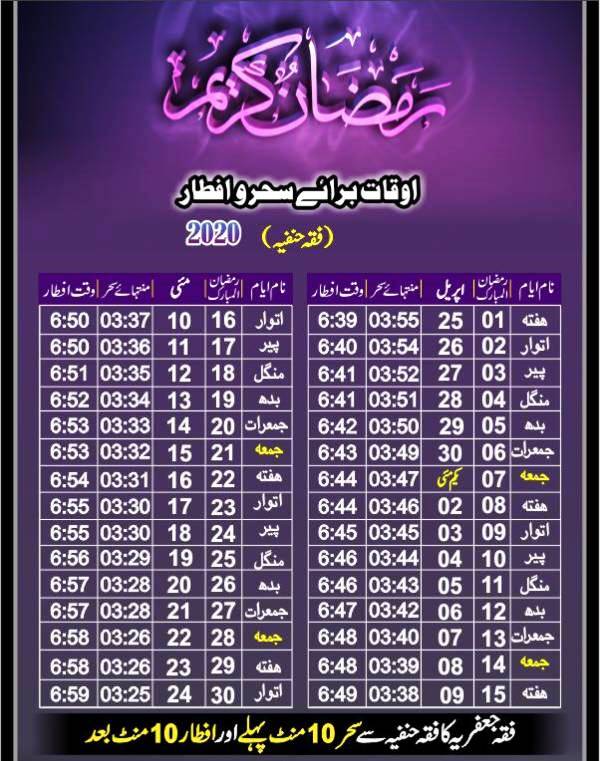 سحر و افطار کے اوقات لاہور
