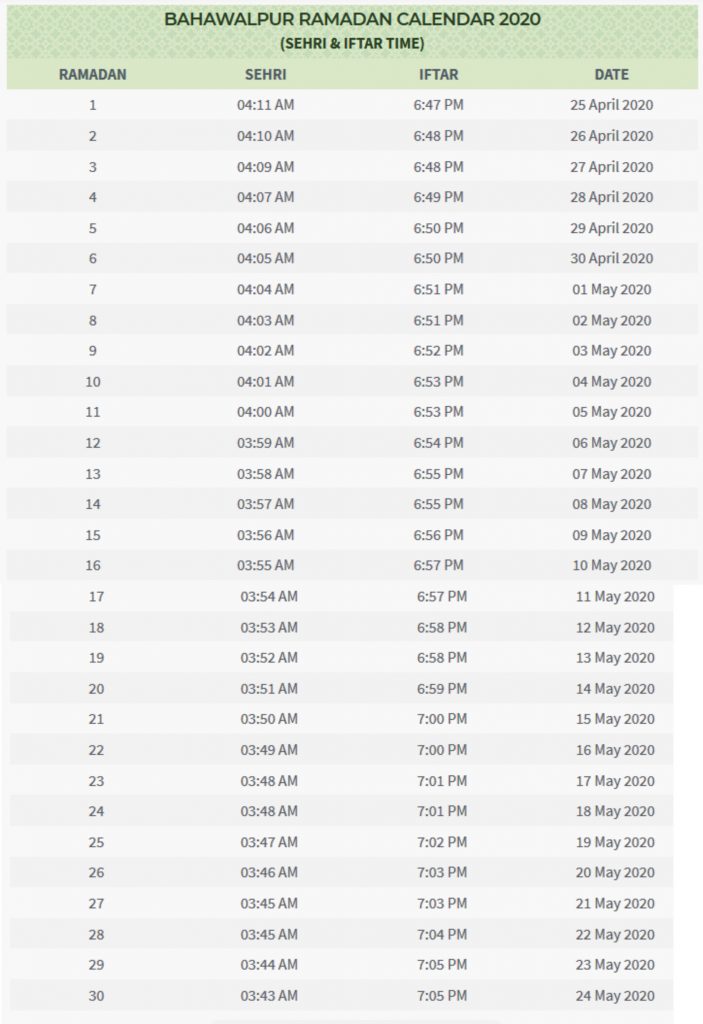 سحر و افطار کے اوقات بہاولپور